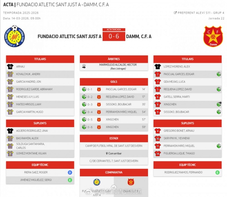 博主“稀盐酸青训频道”写道:当地时间3月14日上午,西班牙加泰罗尼亚大区U11优选联赛(1)第四组第22轮,达姆U11A队6:0战胜圣胡斯特竞技U11A队,中国球员金星辰(2015)首发出战梅开二度。